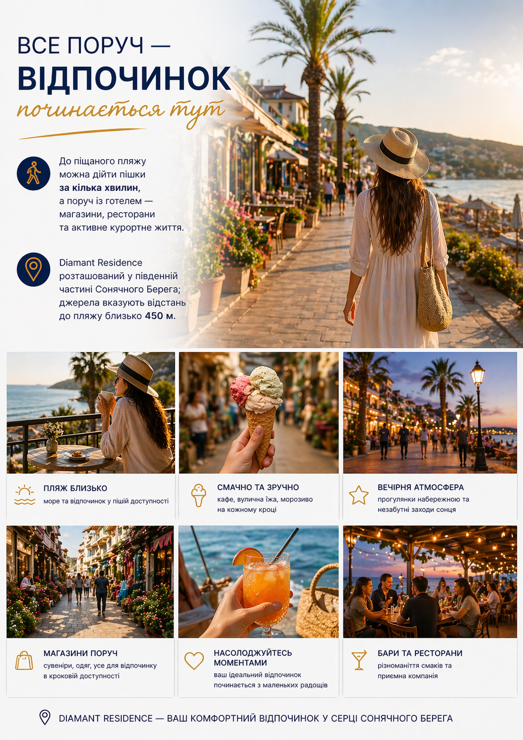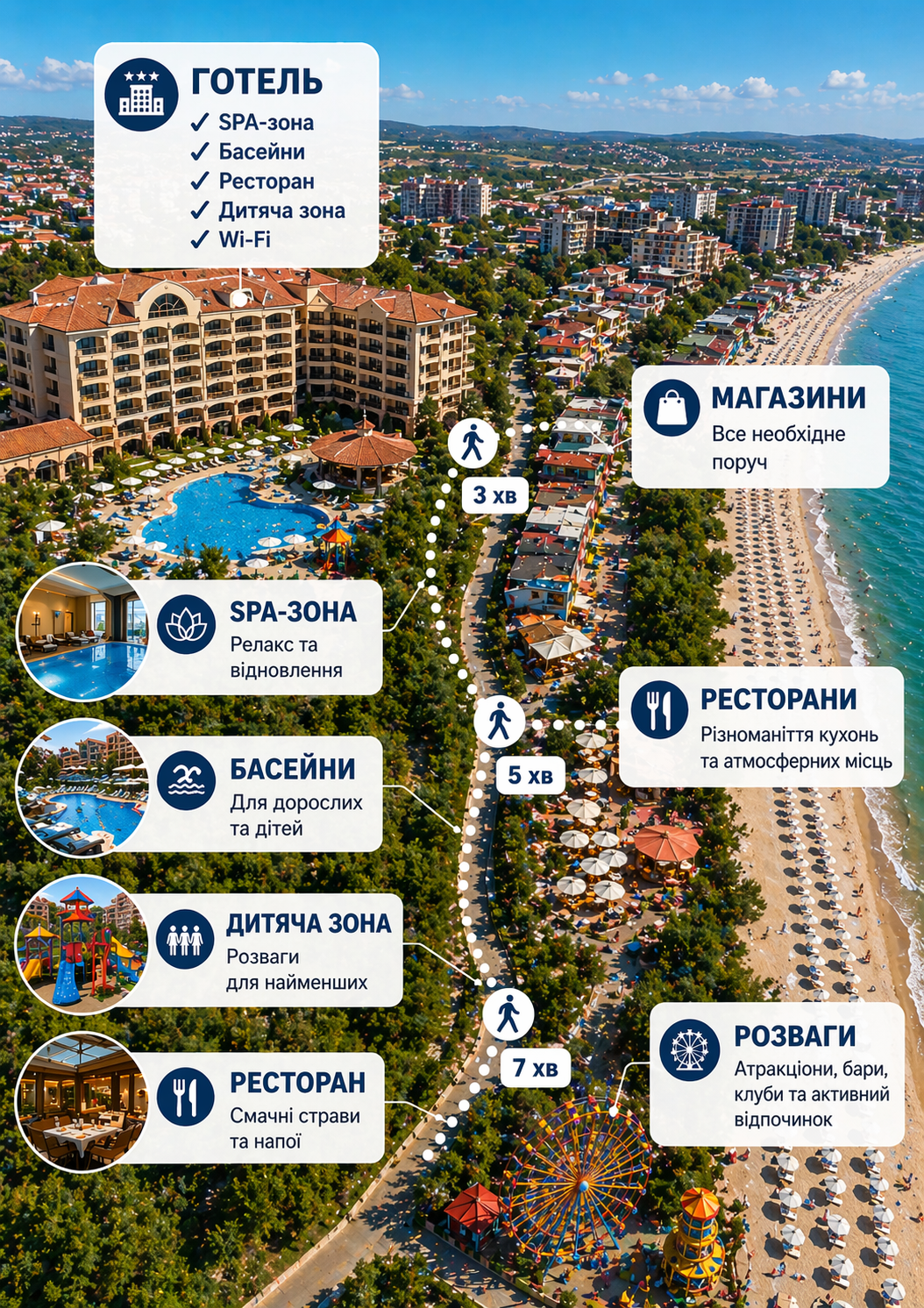 Сонячний Берег, поруч із пляжем, магазинами, ресторанами та розвагами.