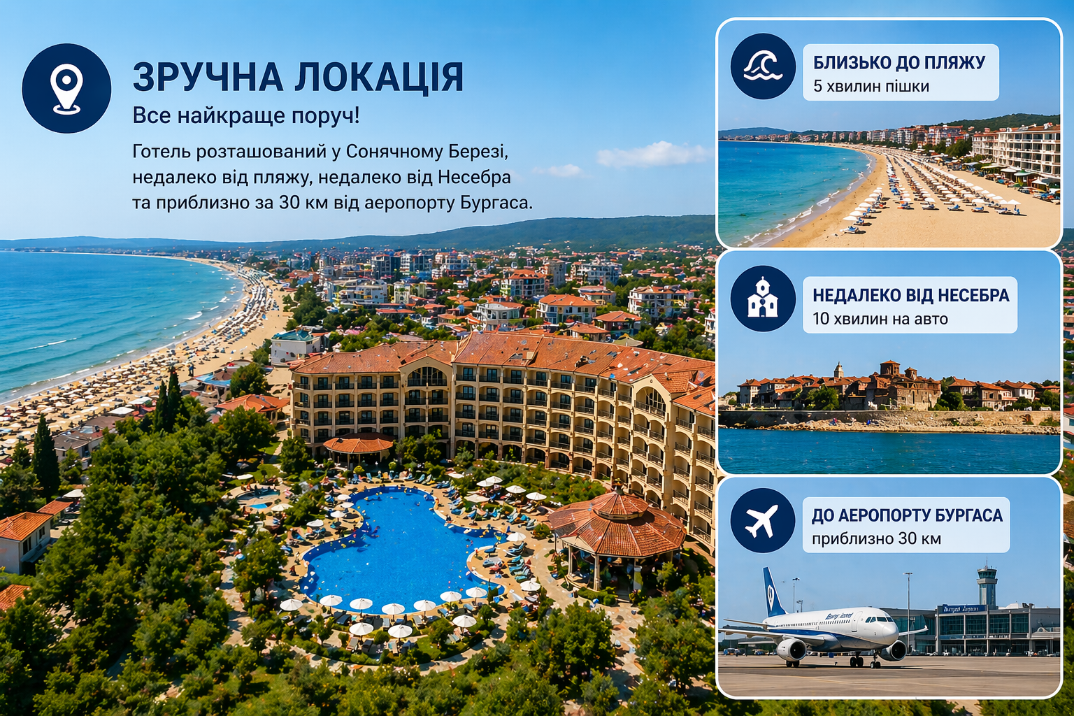 Зручна локація: Готель розташований у Сонячному Березі, недалеко від пляжу, недалеко від Несебра та приблизно за 30 км від аеропорту Бургаса.