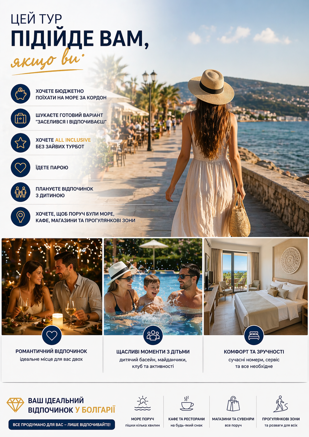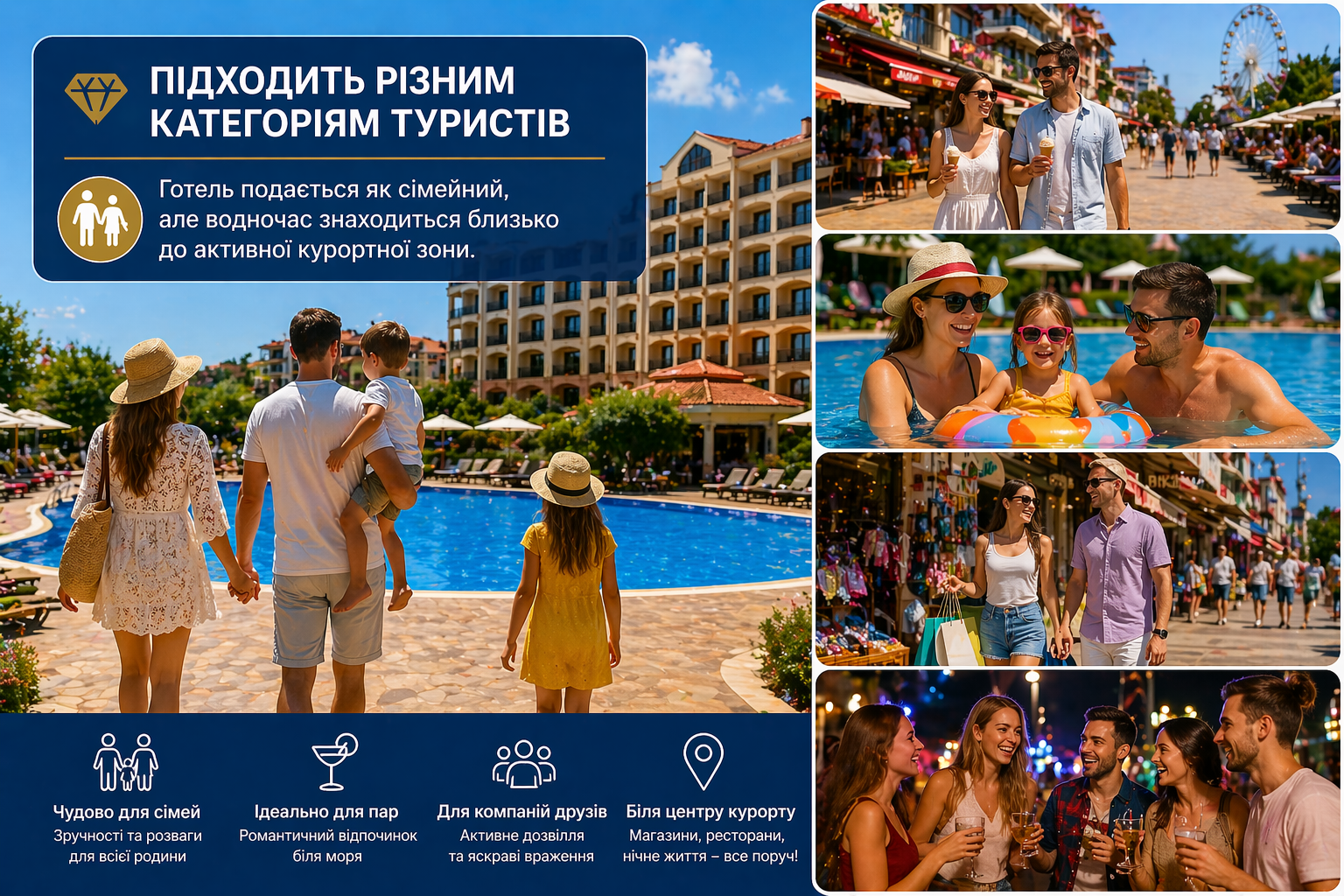 Підходить різним категоріям туристів: Готель подається як сімейний, але водночас знаходиться близько до активної курортної зони.
