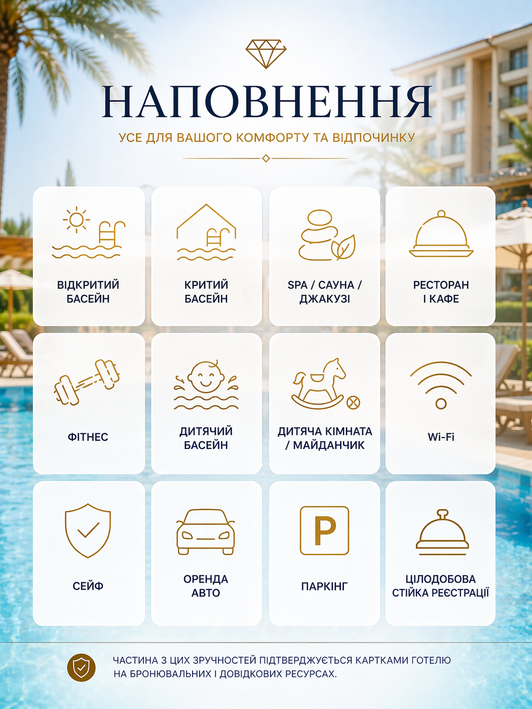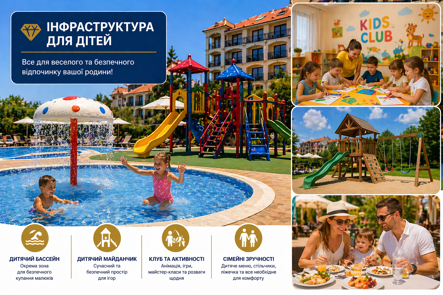 Інфраструктура для дітей: Дитячий басейн, майданчик, клуб/активності та сімейно орієнтовані зручності.